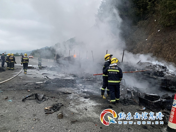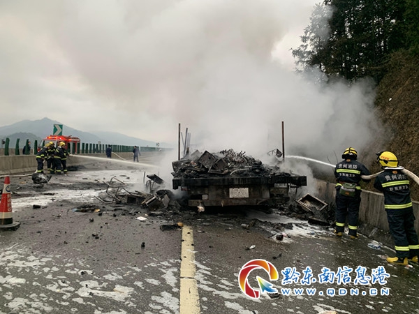 消防指戰員趕到現場后,大貨車已經全部著火,火勢已經處于下降階段,只見火焰和濃煙不斷從車內蜂擁而出,如不及時控制隨時有爆炸的危險。消防指戰員根據現場情況,立即在事故周圍設立警戒區,協助現場交警隊對交通實施管制,然后利用單干線出兩支泡沫管槍進行滅火。火勢得到控制后,為防止復燃,消防指戰員又對車輛進行認真的清理檢查,確保無安全隱患后將現場移交給有關部門。