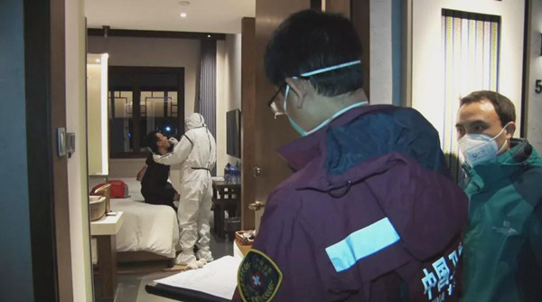 2月9日晚10時許,丹寨縣疾控中心工作人員在丹寨萬達美華酒店,對外埠返回丹寨工作的30余名萬達企業員工進行核酸試紙采樣。