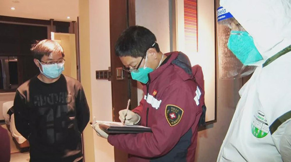 采樣過程中,受檢者在酒店隔離房間內,主動配合疾控中心工作人員進行信息記錄、核酸試紙采樣等工作。