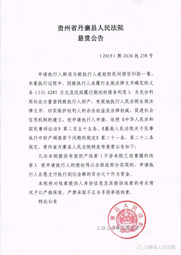 丹寨:未履行一百多萬元的義務,這個被執行人被懸賞了