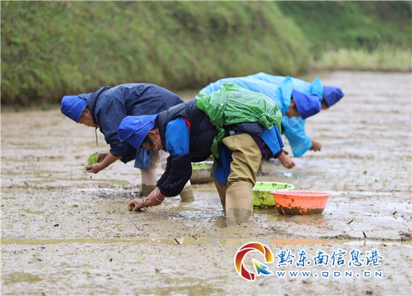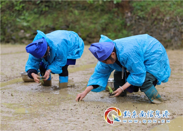 本網訊  4月8日,在貴州省黔東南苗族侗族自治州丹寨縣揚武鎮羊排村,當地農民搶抓農時,在田里移栽水稻秧苗。(陸德華)