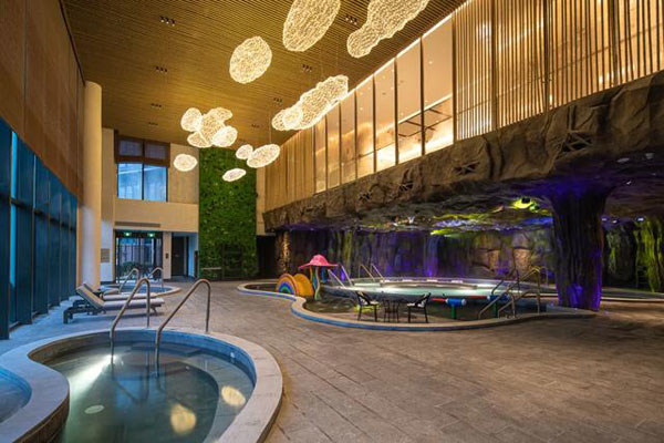 酒店的云沁溫泉中心依山而建,天然的溫泉水資源采取自地下2000米。溫泉中心分為室內(nèi)溫泉區(qū)、室外溫泉區(qū)、多功能休息區(qū)以及各種娛樂休閑設(shè)施,可同時(shí)容納600人沐浴。
