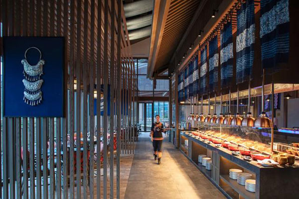 餐廳設(shè)計(jì)充分體現(xiàn)當(dāng)?shù)胤俏镔|(zhì)文化遺產(chǎn)—蠟染、刺繡、造紙、鳥籠等元素,就餐時(shí)在欣賞丹寨秀麗的山水美景同時(shí)又能感受優(yōu)秀的民族傳統(tǒng)文化。