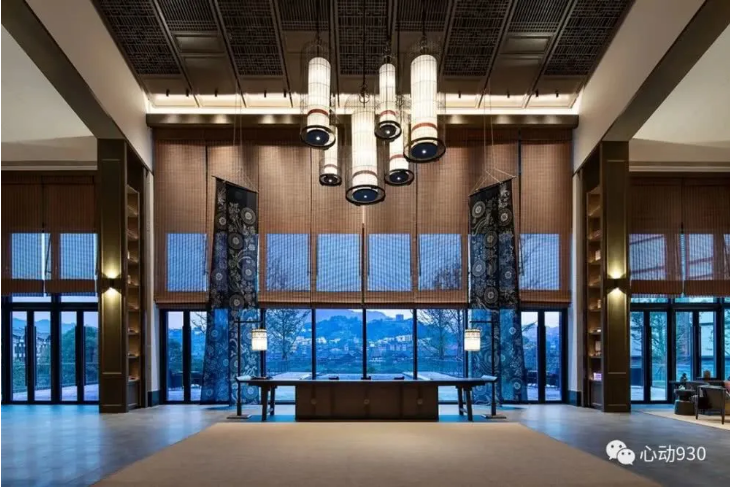 除了泡溫泉、賞美景,這里還有一個(gè)間靜謐的圖書(shū)館——丹調(diào)圖書(shū)館。它坐落于酒店最南側(cè),圍繞一棵數(shù)百年的老桂樹(shù)設(shè)計(jì)成半弧形建筑。室內(nèi)設(shè)計(jì)使用竹子裝飾材料,層層書(shū)架頂天立地貫穿上下,使空間更加有氣勢(shì)與層次。館內(nèi)現(xiàn)藏暢銷(xiāo)類(lèi)、人文社科類(lèi)、地理非遺類(lèi)等各類(lèi)圖書(shū)兩千余冊(cè),一樓設(shè)置了小講堂、景觀閱讀區(qū),二樓為休息區(qū)。在整個(gè)圖書(shū)館內(nèi),穿插點(diǎn)綴設(shè)置了苗族口頭經(jīng)典“賈”文,以墻面雕刻,燈具印文的方式呈現(xiàn),也展現(xiàn)了不一樣的民族文化特征。