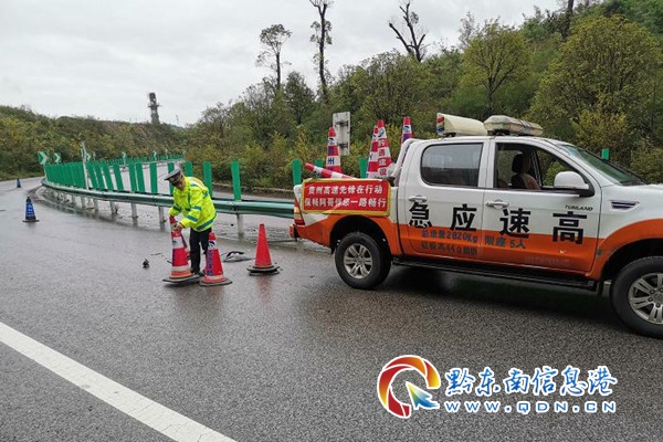 丹寨路政執法大隊接到報警后立即趕往事故現場,對事故車車前后方路段進行渠化,提示過往車輛注意減速慢行通過。