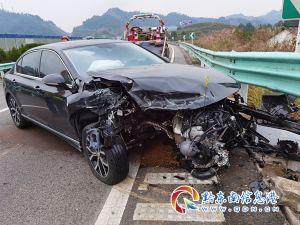 20分鐘后,路政人員行駛至S62余冊高速K114+800上行(凱里往丹寨方向)事故現場,發現一輛轎車撞上護欄橫在行車道上,發動機已經要脫離車身幾乎報廢,路邊一位年輕人,情況十分危急,如果處置不當隨時有可能會發生二次事故。