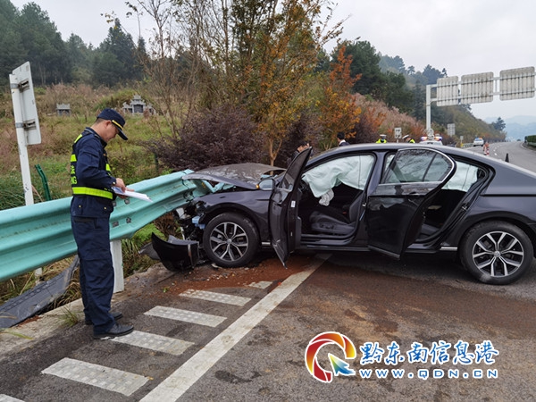 2020年10月26日12時05分,凱里高速公路管理處丹寨路政執法大隊接到報警電話稱凱里至丹寨剛出興仁服務區,一輛小轎車肇事。放下電話路政員立即趕赴現場并同時電話通知轄區“一路三方”進行救援。