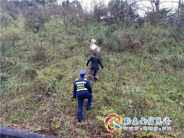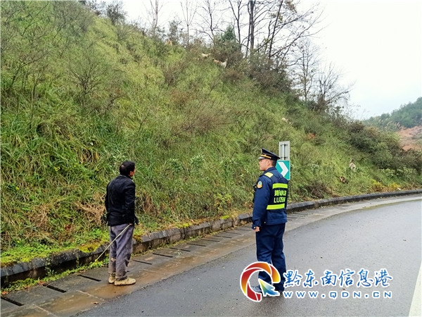 12月7日,黃平路政執法大隊巡查至S62余冊高速K15+000牛大場收費站匝道處,發現一名老人身體倚在中分護欄上放羊。見此情景,路政員立即靠邊停車,督促老人家把羊趕出高速公路用地范圍外,開始老人還不以為然說道;“冬天了這里的草還長得那么好,附近沒什么草了,我在這里看著羊不會上高速的,人站在路邊也沒什么危險。”看到老人安全意識不高,路政員語重心長的告知老人高速公路上放羊的危害,如果造成交通事故或有破壞高速公路設施行為,要負責相關的法律責任。在路政員的宣傳和批評教育下,老人意識到自己在高速公路用地放羊的行為有所不妥,隨即將羊群趕至遠離高速公路的山坡上,承諾再也不到高速公路用地范圍內放羊。