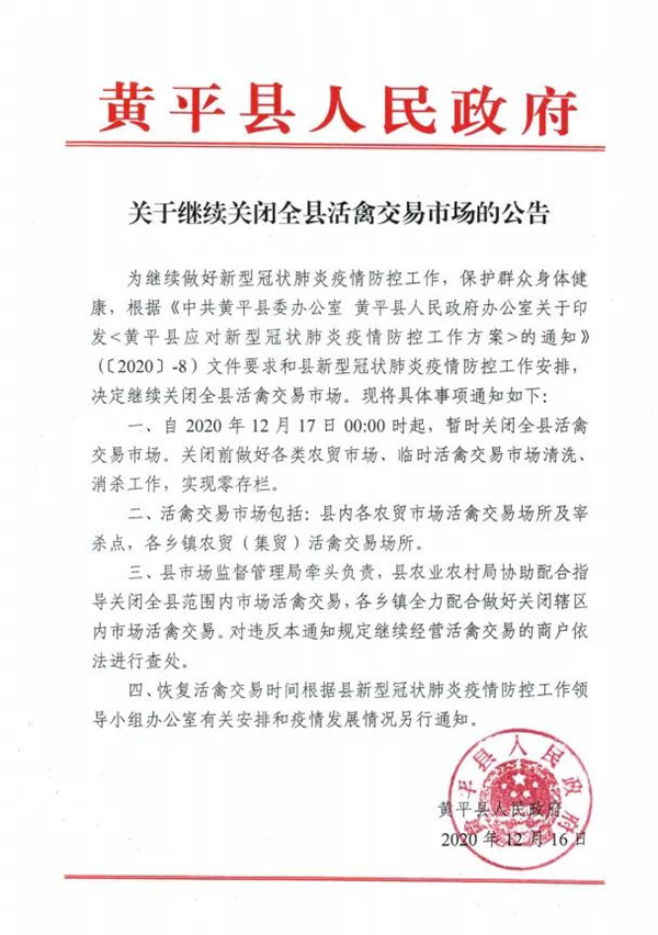 黔東南黃平縣關于繼續(xù)關閉全縣活禽交易市場的公告