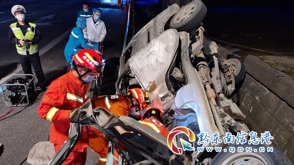 救援人員到達(dá)事故現(xiàn)場(chǎng)后,經(jīng)現(xiàn)場(chǎng)偵查發(fā)現(xiàn),一輛面包車(chē)發(fā)生側(cè)翻,車(chē)身嚴(yán)重變形,車(chē)內(nèi)有2人被困,駕駛員被方向盤(pán)牢牢卡住無(wú)法動(dòng)彈,情況十分危急,由于救援現(xiàn)場(chǎng)光線較差給救援增加了一定難度。