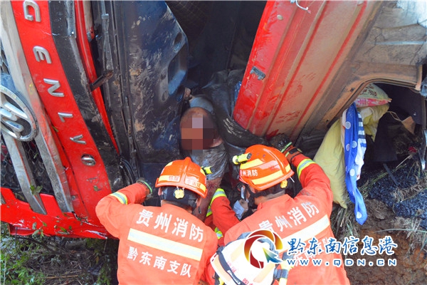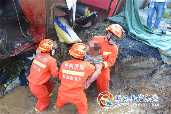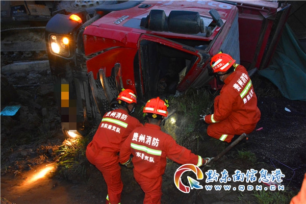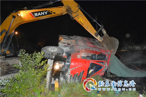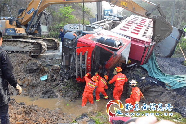 救援人員到達現場后,經現場偵查發現:一輛滿載瀝青的大貨車側翻在公路旁的水溝邊,車上瀝青傾倒在田里,被困駕駛員剛好處于側翻的那一頭,車門被水溝邊的泥土包圍,救援人員與被困駕駛員溝通得知,他的身體被方向盤卡住,雙腳也被離合器卡住無法動彈。了解情況后,指揮員立即與相關部門聯系調派挖掘機與吊車趕往事故現場。在挖掘機到達事故現場后,經過現場救援人員與挖掘機師傅溝通決定,挖掘機師傅首先將駕駛室車門旁的的泥土挖開,為防止在挖掘過程中導致車輛下滑對被困人員造成二次傷害,吊車駕駛員將起吊點設在了副駕駛下方的鋼板上,并緩慢地將車頭吊起。車頭吊起后,救援人員立即展開救援。