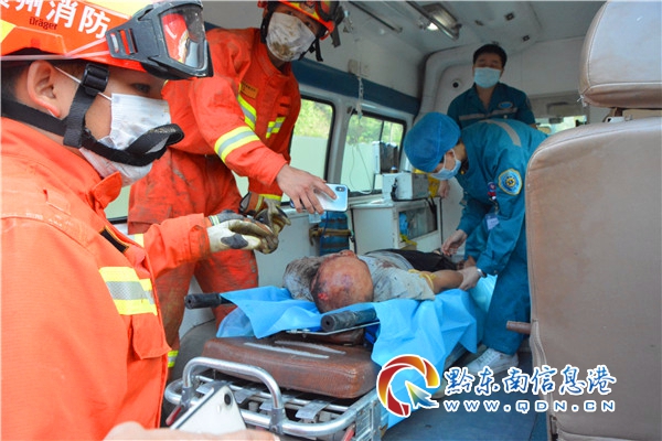 救援人員使用液壓剪對方向盤進行剪切,方向盤剪開后,被困人員上半身沒有支撐點,救援人員就用雙手撐著被困人員。此時,被困人員的雙腿還卡在離合器上,由于救援空間狹小,救援人員將大繩捆在方向盤和挖掘機上,利用挖掘機做牽引,將救援空間擴大,隨后,救援人員使用液壓頂桿撐開座位與離合器之間的距離。經過近3小時的救援,被困人員被成功救出并移交給現場醫護人員。