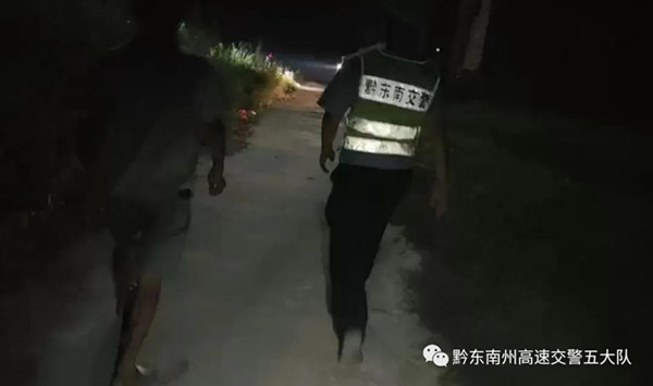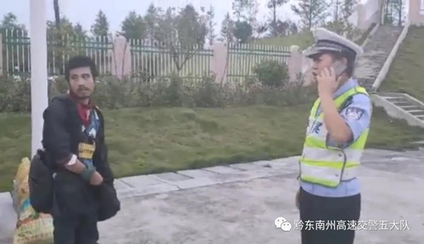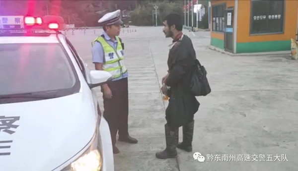 19時28分,高速交警五大隊民警正準(zhǔn)備上高速巡邏時,發(fā)現(xiàn)一名穿著奇異,背著兩大袋物件的男子正從錦屏收費站入口上高速。民警立即下車將其攔下,看著穿著像是一名流浪漢。民警將其帶到路邊,通過溝通,民警發(fā)現(xiàn)該男子精神有些異常,對自己家里面的情況都不是很清楚,只知道自己的家在敦寨鎮(zhèn)亮司村,身上也沒有手機和聯(lián)系方式。天馬上就要黑了,民警立即打電話到亮司村村委。