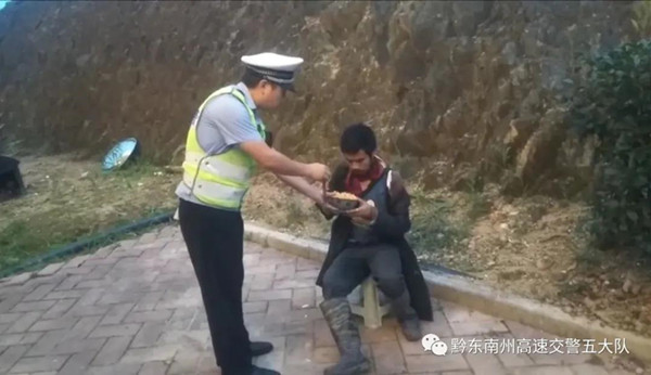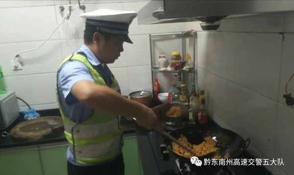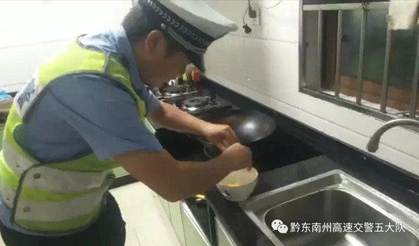 原想讓他們來高速收費站路口接人,但是考慮到安全問題,民警決定先帶男子回大隊喝水吃飯,然后親自送他回家。來到大隊后,民警見該男子面容憔悴、神情恍惚,可能是長時間沒有吃東西了于是民警立即下廚做了蛋炒飯和倒上熱水給男子,慢慢溝通才得知,原來男子將近一個多星期沒有好好吃飯了。