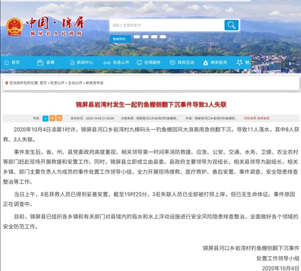 當日上午,8名獲救人員已得到妥善安置,截至19時25分,3名失聯人員已全部被打撈上岸,但已無生命體征。事件原因正在調查中。