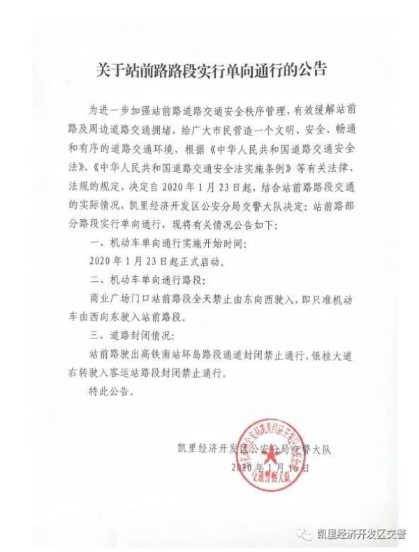 為進(jìn)一步加強(qiáng)站前路道路交通安全秩序管理,有效緩解站前路及周邊道路交通擁堵,給廣大市民營造一個文明、安全、暢通和有序的道路交通環(huán)境,根據(jù)《中華人民共和國道路交通安全法》、《中華人民共和國道路交通安全法實施條例》等有關(guān)法律、法規(guī)的規(guī)定,決定自2020年1月23日起,結(jié)合站前路路段交通的實際情況,凱里經(jīng)濟(jì)開發(fā)區(qū)公安分局交警大隊決定:站前路部分路段實行單向通行,現(xiàn)將有關(guān)情況公告如下: