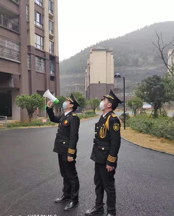 小區(qū)工作人員在小區(qū)內(nèi)流動(dòng)宣傳防護(hù)知識(shí)