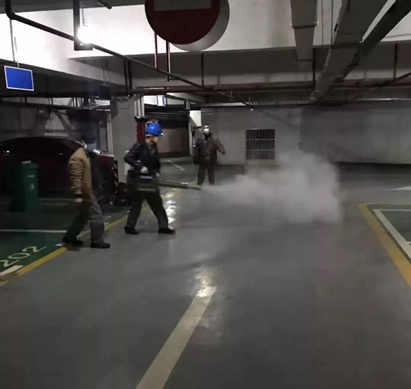 物業(yè)工作人員在對(duì)停車場(chǎng)進(jìn)行消毒