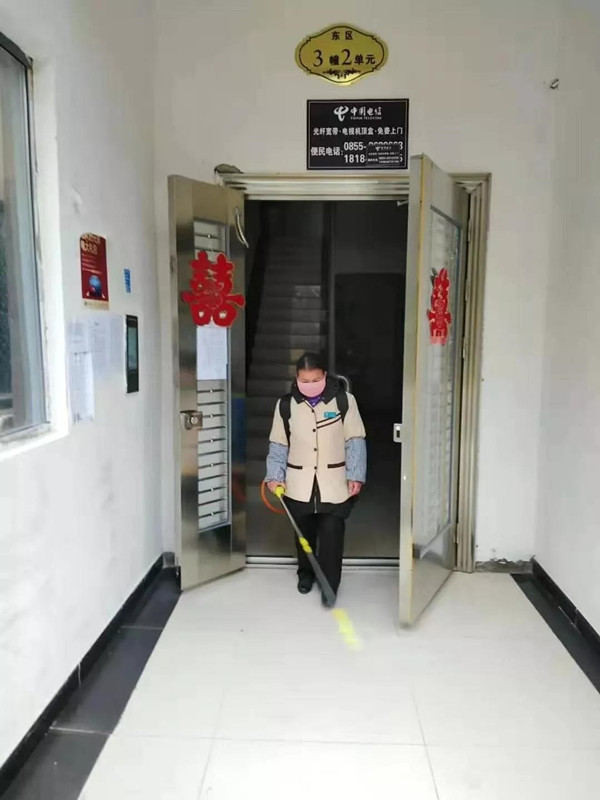 物業(yè)工作人員在對(duì)樓道進(jìn)行消毒