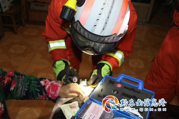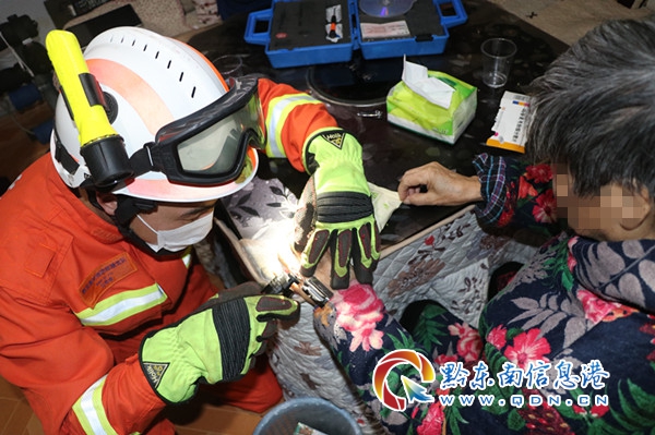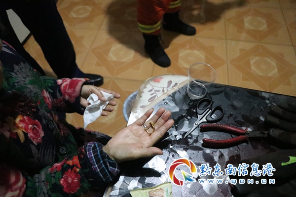 消防指戰員到達現場后,經觀察發現:老人左手無名指上戴著一枚純金戒指,由于血液不通造成手指輕微浮腫,如果不能及時將戒指從手指上取下來,會給手指造成嚴重傷害。根據此情況,消防指戰員立即使用“指環切割機”小心翼翼地實施救援。在救援過程中,消防指戰員不時詢問老人是否有疼痛感,并不斷使用冷水對老人手指進行降溫。經過10多分鐘的努力,消防指戰員成功將老人手上的金戒指取下。