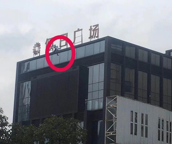 (一中年女子爬上凱里文化北路假日廣場售樓部樓頂上)