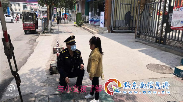 4月9日上午11時(shí)左右,灣溪執(zhí)法中隊(duì)隊(duì)長(zhǎng)楊繼正帶領(lǐng)隊(duì)員楊鴻奎、張同楊、李波、伍勁松等人在轄區(qū)進(jìn)行常規(guī)市容巡查,當(dāng)巡查到清江路火車站附近時(shí),發(fā)現(xiàn)路邊一個(gè)小女孩正在哭,身旁也沒(méi)有大人。