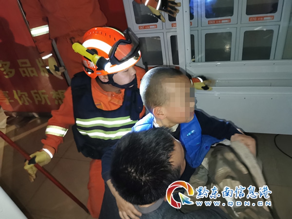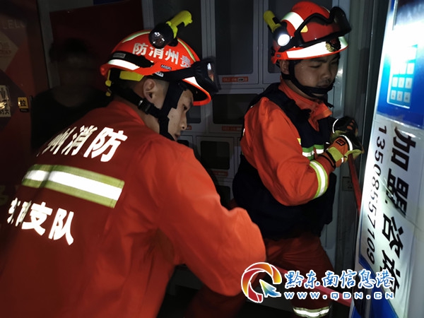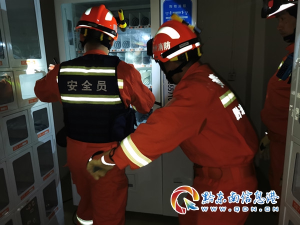 4月11日21時05分,貴州省黔東南州凱里市消防救援大隊環城東路消防救援站接到報警:凱里市牛場壩一名小孩被卡在廢置的飲料自動販賣機內,環城東路消防救援站立即出動趕赴事發現場。