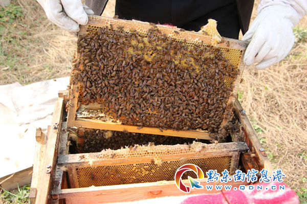 圖為潘光中支書正在查看中蜂生長情況