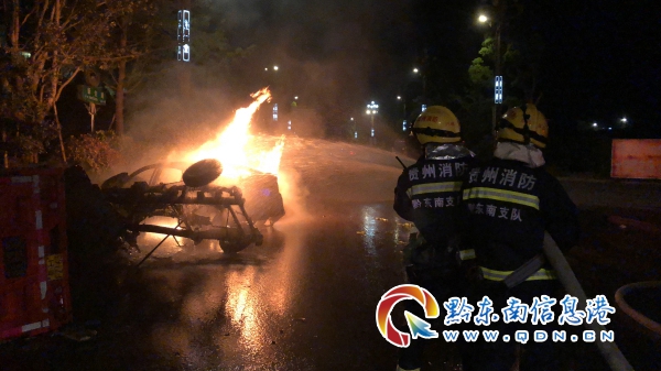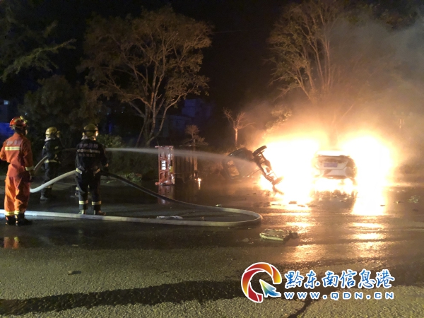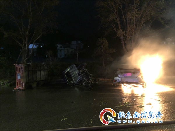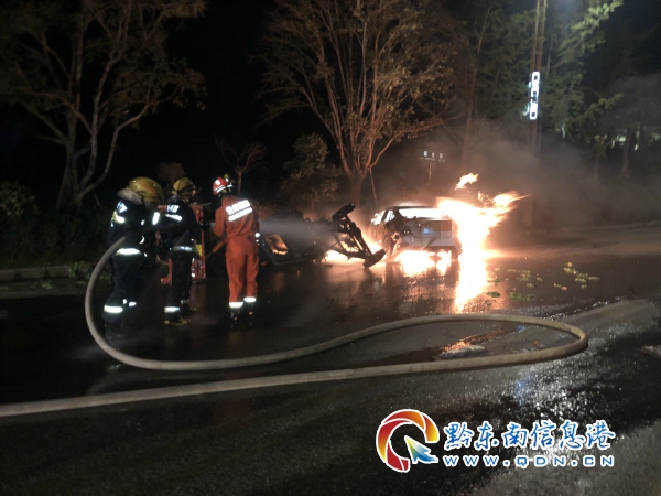 消防救援人員抵達現場后發現,一輛轎車與一輛三輪摩托車迎面相撞起火,三輪摩托車貨架與底盤分離,轎車車頭嚴重變形,地面上散落了一地的碎玻璃,由于油箱在撞擊中破裂漏油,導致兩車相撞摩擦起火,現場一片狼籍,轎車司機與乘坐三輪摩托車的兩名老人均已自行離開車內,并在距離事故車輛三米左右位置等待救援。