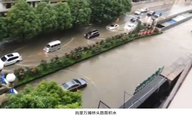 ​5月31日下午4點半后,凱里地區突降暴雨,造成多條街道出現積水,凱里寧波路老騰龍酒店門口處的道路被水淹沒,造成交通堵塞。