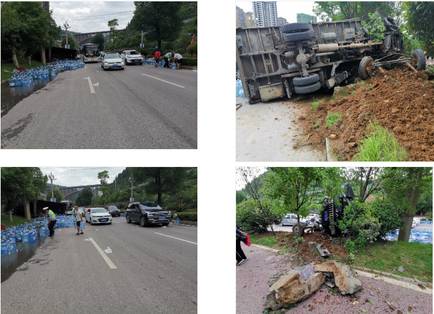 到達(dá)事故現(xiàn)場后,交警發(fā)現(xiàn)事故車輛側(cè)翻在綠化帶上,滿車的飲用桶裝水散落一地,占用了一個(gè)車道,貨車水箱脫落,前車輪已脫離車體,過往車輛通行受到影響,交警隨即開展分工合作,一邊指揮疏導(dǎo)交通,幫助駕駛員把散落的桶裝水清理至路邊,一邊對事故現(xiàn)場進(jìn)行勘查,并對駕駛員進(jìn)行詢問。經(jīng)詢問得知,貨車駕駛員禹某駕駛貨車從三棵樹往市區(qū)行駛,當(dāng)行駛至金山大道(242小區(qū)入口)紅綠燈路口時(shí),準(zhǔn)備減速時(shí)發(fā)現(xiàn)剎車突然失靈,禹某曾多次嘗試踩剎車都毫無反應(yīng),最終導(dǎo)致車輛徑直沖向綠化帶,側(cè)翻在地。