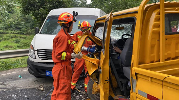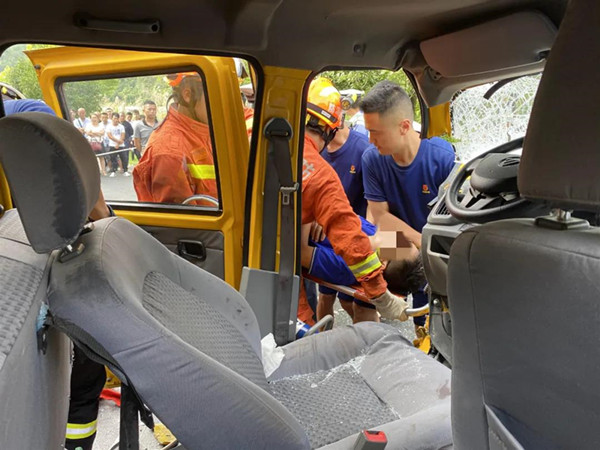 救援人員到達現場后,通過現場觀察得知,系一輛黃色貨車與一輛救護車在該路段迎面相撞,其中貨車駕駛室受損嚴重變形,其駕駛員雙腿遭受擠壓無法拔出,臉上與地上有不少血漬,情況緊急。按照指揮員部署,救援人員迅速使用液壓破拆工具將駕駛室的門拆除,以便更好的觀察內部情況,確定了被困人員的雙腿受壓位置后,在充分保障駕駛員安全的情況下,逐步對車輛進行破拆分解。
