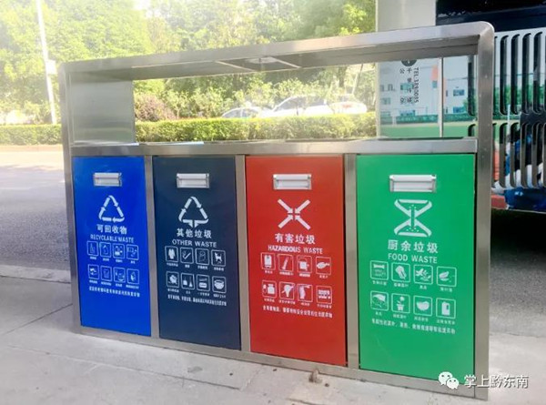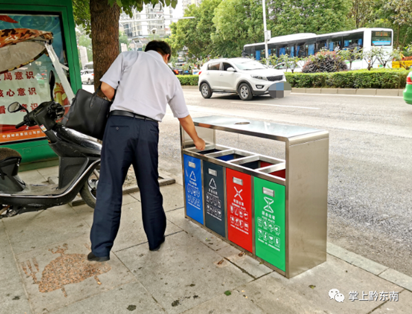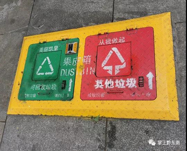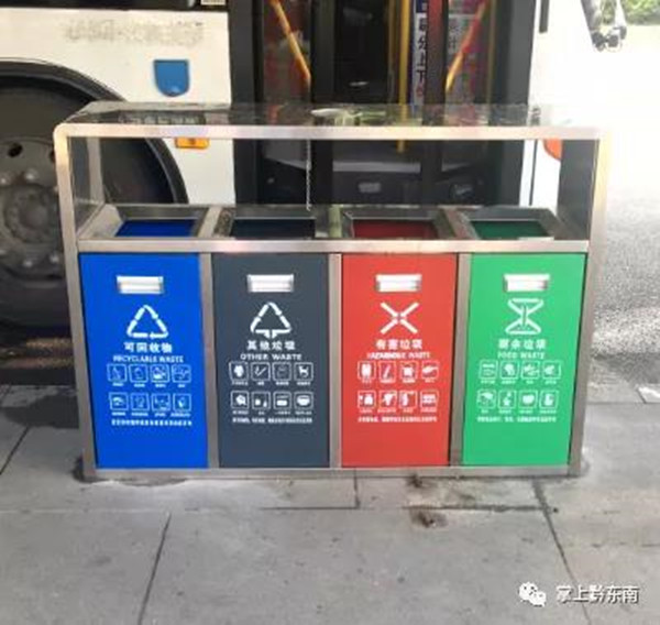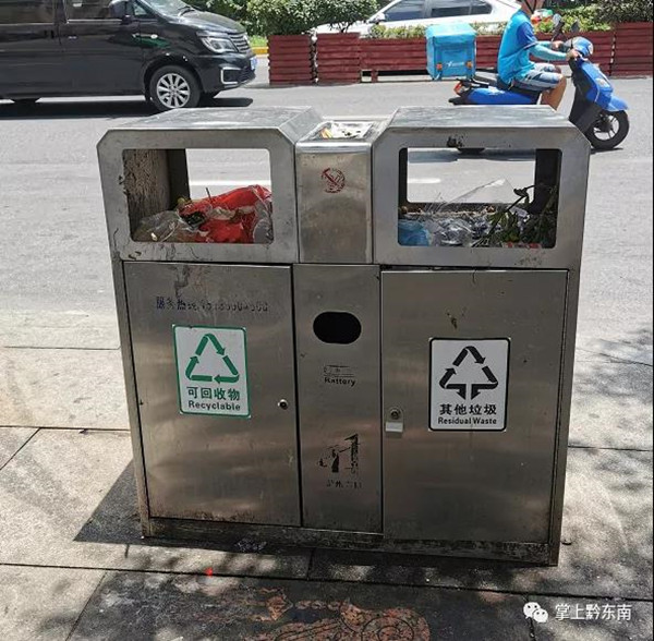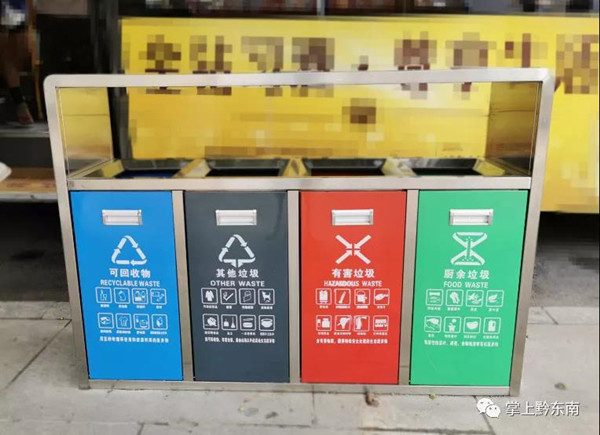 2020年7月29日,記者在凱里市萬博廣場、大十字、國貿(mào)附近見到一個個“新鮮”的果皮箱,它們有四個投入口,分別寫著“可回收物”、“其他垃圾”、“有害垃圾”、“廚余垃圾”,對應(yīng)四種不同分類,還印有相對應(yīng)的英文字母,以及該分類常見的物品,這在凱里還是首次見到!