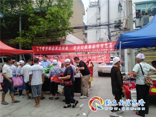 為營(yíng)造我鎮(zhèn)禁毒“大掃除”專項(xiàng)行動(dòng),全民動(dòng)員、全民知曉、全民參與的禁毒人民戰(zhàn)爭(zhēng)濃厚氛圍。2020年8月13日上午,利用趕集日。灣水鎮(zhèn)禁毒辦組織派出所、鎮(zhèn)團(tuán)委、鎮(zhèn)安監(jiān)站、黨員禁毒志愿者等部門聯(lián)合開(kāi)展禁毒“大掃除”專項(xiàng)行動(dòng)宣傳活動(dòng)。