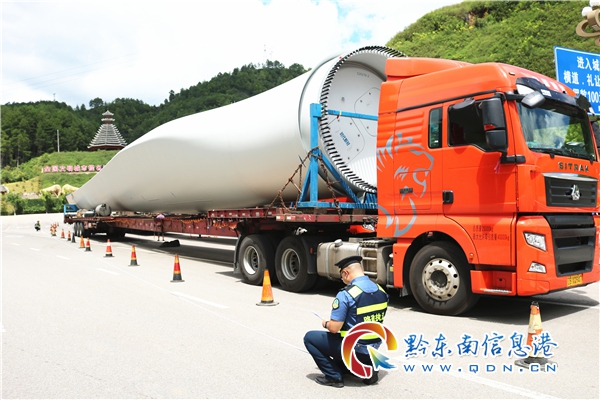 2020年8月22日上午,貴州省凱里高速公路管理處凱里路政執法大隊接到上級有關部門通知,有六輛運輸風電葉片的車輛從湖南境內駛入貴州劍河,由于劍河收費站匝道小,74米長的大件運輸車輛無法通過,需從凱里東收費站出站后,再次申辦大件運輸許可證駛往劍河,請大隊前往核查并辦理相關手續。