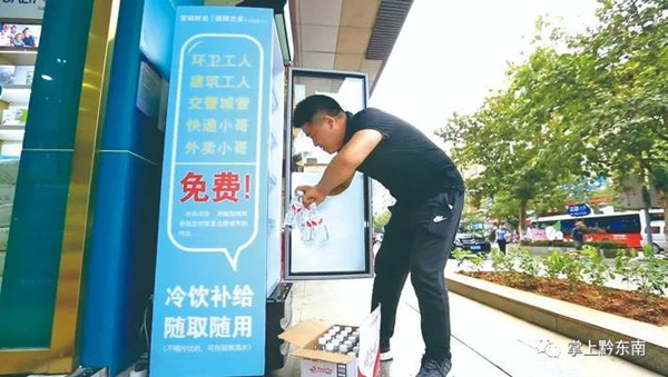 “轟轟轟,轟轟……噠……”此時(shí),身著醒目黃色工作服的外賣小哥萬(wàn)文濤騎著摩托車從記者身邊經(jīng)過(guò),在凱里市行政中心沿街一處店鋪門口熄了火,在貼有免費(fèi)字樣“愛(ài)心冰水”的冰柜里,非常嫻熟的取出了一瓶礦泉水,隨即一飲而盡。