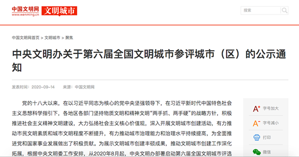 8月以來,由各省、自治區、直轄市文明委申報推薦,經中央紀委辦公廳、中央政法委、生態環境部、農業農村部、公安部、應急管理部、市場監管總局嚴格審核,報中央文明委審定批準,263個提名城市(區)獲得第六屆全國文明城市評選參評資格。從9月14日至18日進行公示。