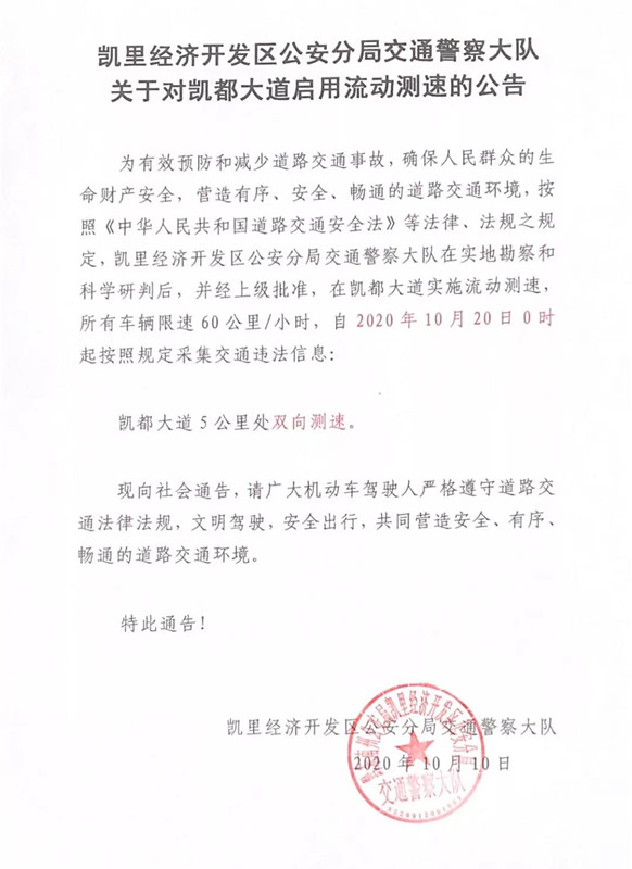 為有效預防和減少道路交通事故,確保人民群眾的生命財產安全,營造有序、安全、暢通的道路交通環境,按照《中華人民共和國道路交通安全法》等法律、法規之規定,凱里經濟開發區公安分局交通警察大隊在實地勘察和科學研判后,并經上級批準,在凱都大道實施流動測速,所有車輛限速60公里/小時,自2020年10月20日0時起開始按照規定采集交通違法信息: