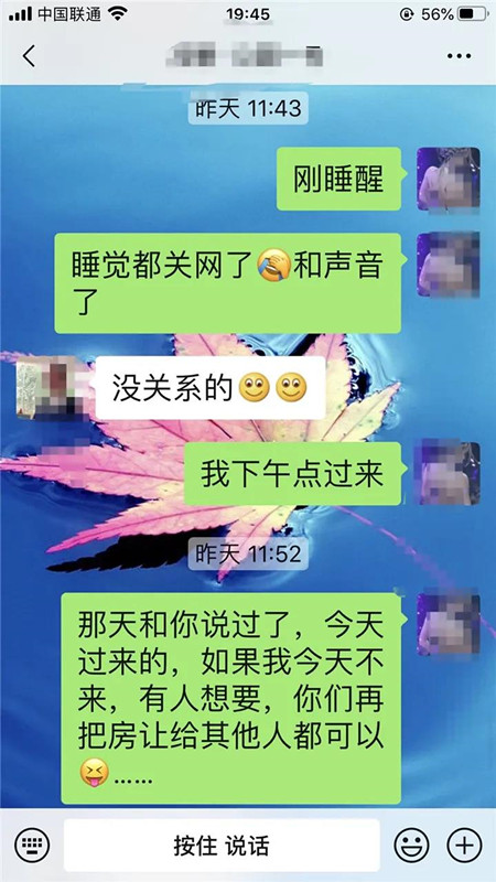 但是這時(shí)這位工作人員說(shuō),房子已經(jīng)賣掉了。張女士非常著急,趕緊發(fā)語(yǔ)音,但聊天記錄顯示,工作人員回應(yīng)她的,是微笑的表情。