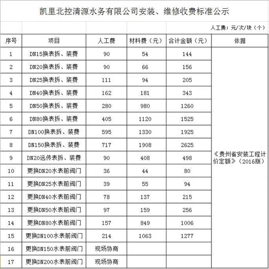 凱里北控清源水務有限公司安裝、維修收費標準公示