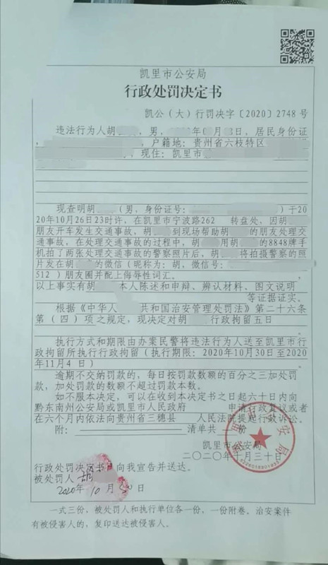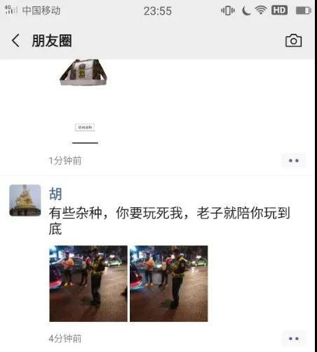 10月26日,凱里市公安局交警大隊接到群眾舉報稱:一昵稱為“胡”的網民將事故交警在處理事故的照片發到朋友圈,并配有辱警言論,根據熱心群眾提供的信息,事故民警立即對該信息的發布人進行核查,迅速鎖定了發布者胡某某的個人信息,并對其進行口頭傳喚。