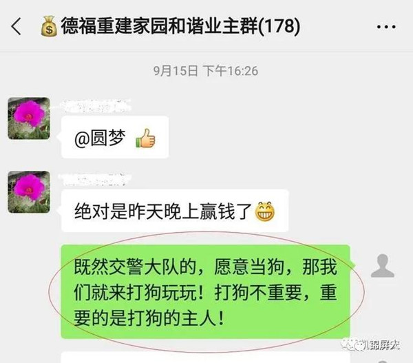 經(jīng)查明,該男子名叫蔡某興(男,41歲,凱里市人)于2020年09月15日16時(shí)30分許,在微信群“德福重建家園和諧業(yè)主群”內(nèi)看見該群其他成員發(fā)表的一張交警在德福新區(qū)小區(qū)內(nèi)對(duì)違停車輛處罰告知單的照片后,就在該群發(fā)表“既然交警大隊(duì)的,愿意當(dāng)狗,那我們就來打狗玩玩!打狗不重要,重要的是打狗的主人”的辱罵民警的言論,其行為已構(gòu)成尋釁滋事,按照《中華人民共和國(guó)治安管理處罰法》之規(guī)定,該局依法對(duì)違法行為人蔡某興處以行政拘留五日的處罰。
