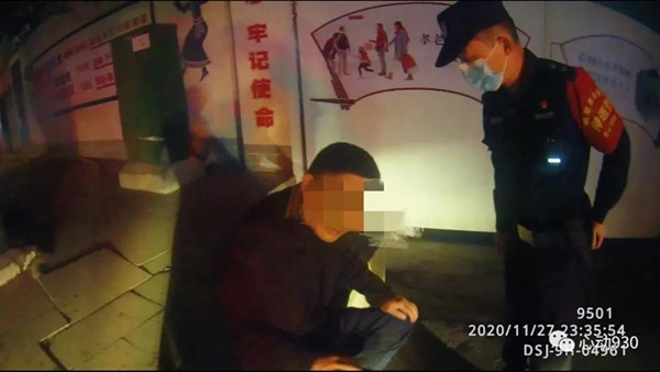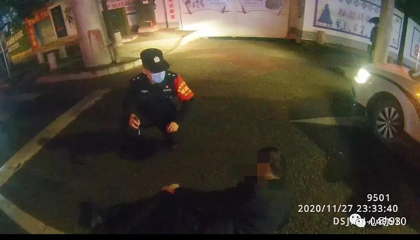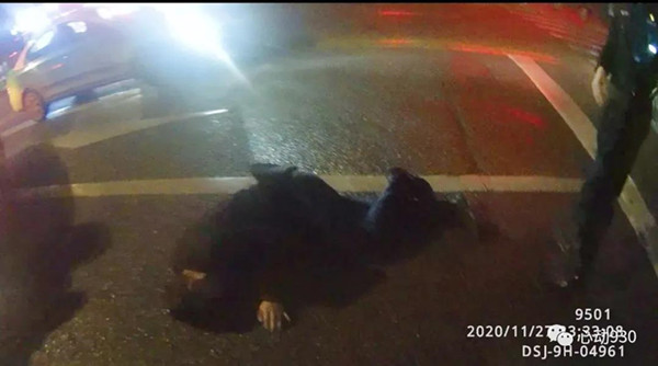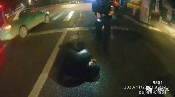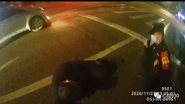 2020年11月27日23點32分許,凱里市公安局特巡警大隊城西中隊隊員李鑫龍、扈鵬像往常一樣,正在轄區開展治安巡邏,當他們巡邏至清平南路路段時,發現在川流不息的行車道的“正中間”躺了一個人。“當時那人的衣服、褲子都是黑色的,且整個身子蜷縮一團,如不近距離觀察很容易當成一個大號黑色垃圾袋,且附近車速都很快,情況十分危險。”特巡警隊員李鑫龍告訴記者。