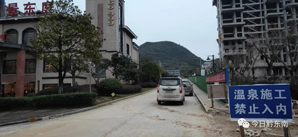 在小區里面,我們看到明顯的提示牌,上面寫著溫泉施工,禁止入內,溫泉目前還在施工階段。