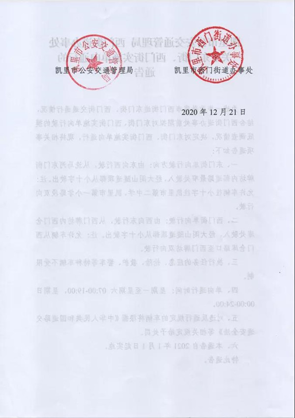 一、東門街單向行駛方向:由東向西行駛,從洗馬河東門街牌坊內部道路最窄處駛入,經大閣山隧道頂部從小十字駛出。注:允許車輛往小十字往凱里市第二中學、凱里市第一小學路段雙向行駛。