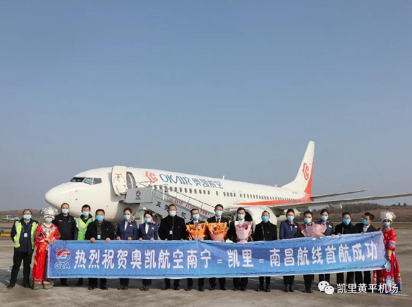 由奧凱航空執飛,每周一、周三、周五、周日各一班,航班時刻為:14:10從南寧起飛,15:35到達凱里,16:20從凱里起飛,17:50到達南昌;18:40從南昌起飛,20:25到達凱里,21:10從凱里起飛,21:40到達南昌。