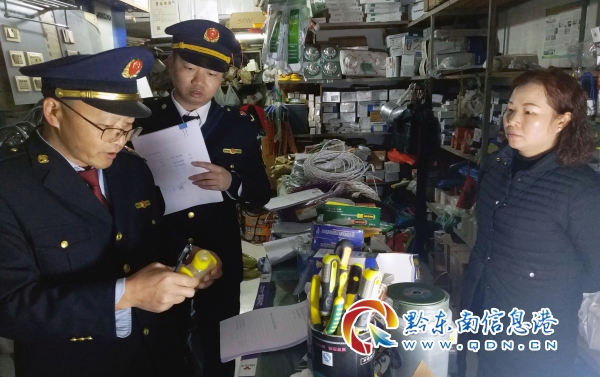 圖為執(zhí)法人員向經(jīng)營者宣傳電氣產(chǎn)品及檢查場面