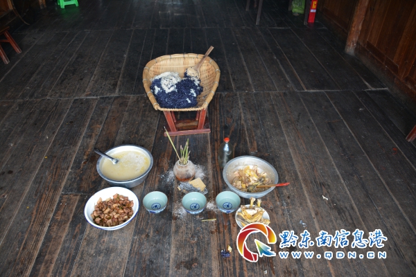 開(kāi)秧門(mén)當(dāng)天上午各家農(nóng)戶(hù)用“五彩糯米飯”和豬、雞肉并燒香化紙祭祀的情景