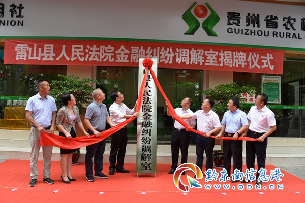 揭牌儀式上,雷山縣委常委、政法委書記黃超群作了歡迎致辭,黔東南州中級人民法院黨組書記、院長雷勇發表揭牌講話。省聯社駐黔東南州黨工委書記潘榮熙,雷山縣委書記黃清發,縣人行、縣銀保監管組、縣法院及縣農信社主要領導及職工代表出席揭牌儀式及座談會。