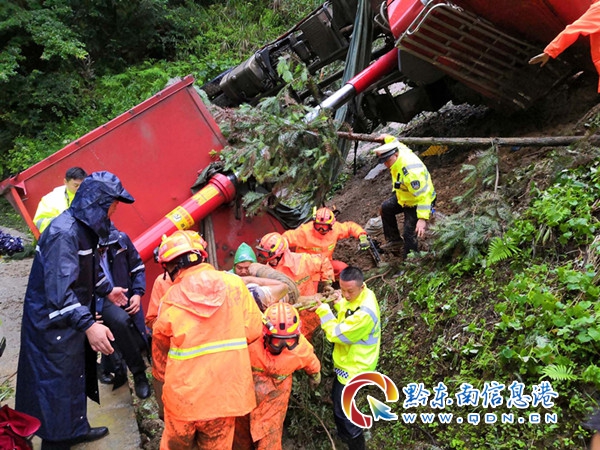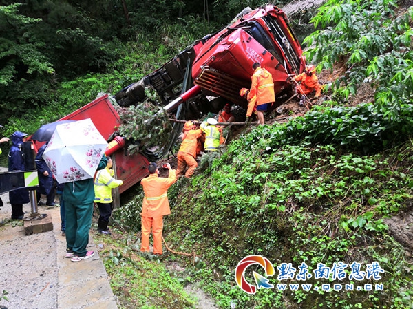 據(jù)貨車(chē)駕駛員介紹,本人叫聶某平,貴州習(xí)水人,從丹寨拉沙子到雷榕高速第五分段,由于晚上下大雨,視線較差,路面狹窄,且車(chē)廂裝滿(mǎn)沙子,導(dǎo)致車(chē)輛失控翻下路坎。